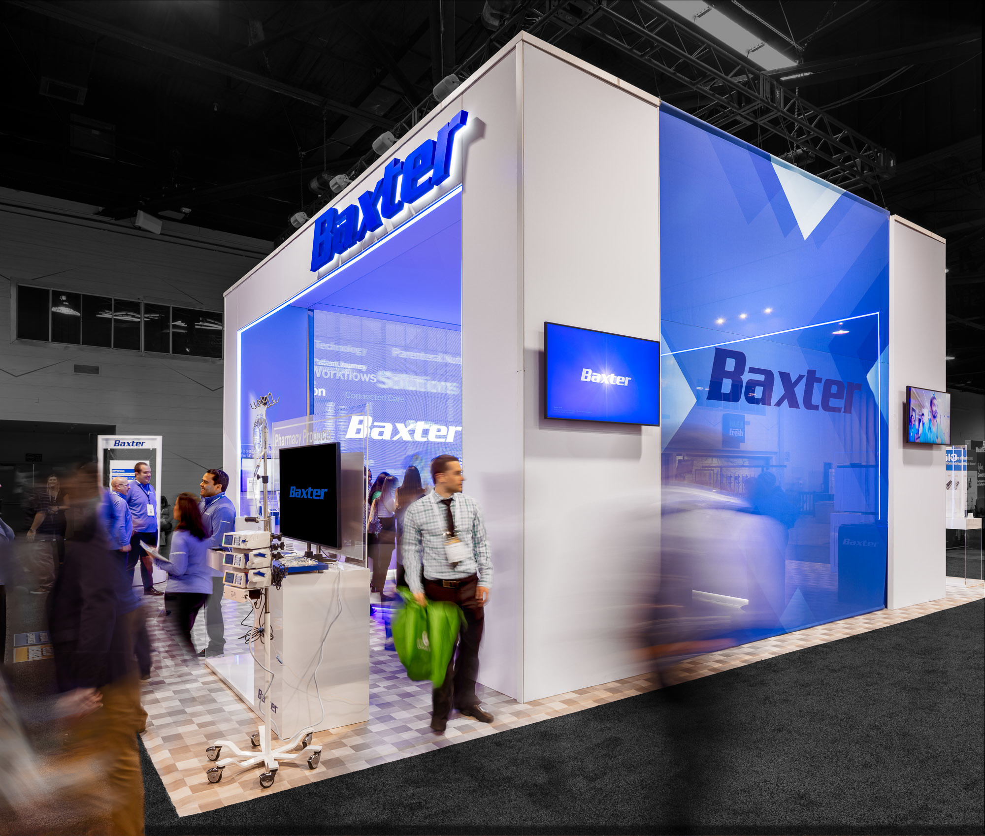 AV integration helps brands create digitally-focused experiences that maximize engagement and brand messaging. Baxter’s exhibit featured a towering arch with an integrated LED curtain that created an enclosed atmosphere while showcasing branded messaging that unified Baxter's business groups. The exhibit's structure itself served as both physical architecture and a digital canvas, allowing Baxter to immerse attendees in brand messaging while facilitating exploration of their product portfolio.