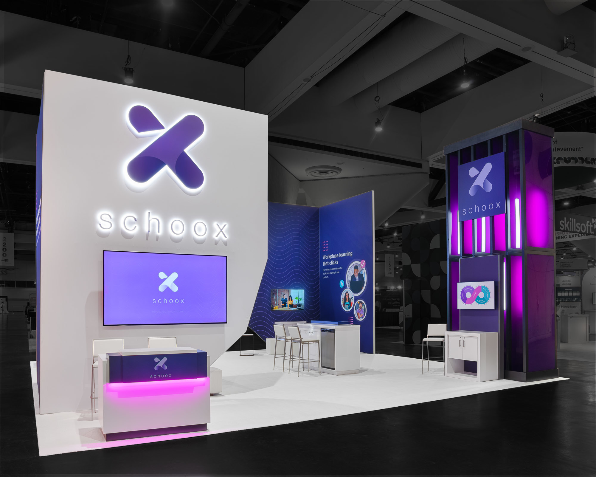 Following a rebrand, Schoox needed their exhibit at ATD to capture their renewed identity and "people-first" philosophy. Hamilton created an immersive environment that showcased their updated brand through whimsical architecture and bold design choices. The space featured neon purple and pink lighting, digital screens, and large lifestyle images that created a distinct environment. Multiple demonstration areas and casual lounge spaces allowed for both product showcases and relaxed client conversations. The exhibit highlighted Schoox's position as pioneers of the industry's only "Mobile First" platform, leading to increased lead capture and product demonstrations and a remarkable 90%+ client satisfaction rate. This example shows how thoughtful graphic design successfully launches a new brand identity while driving concrete business results.