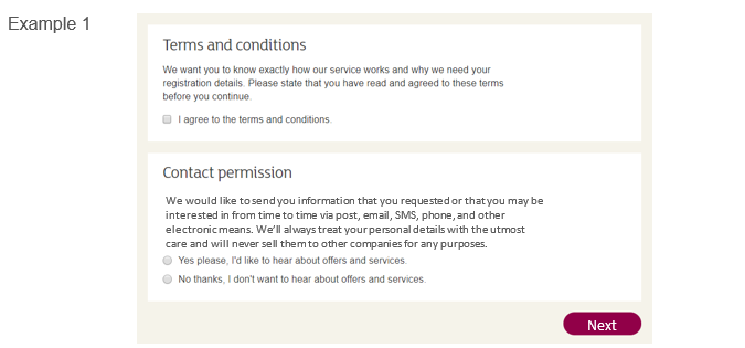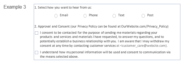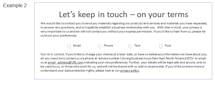 Below are some opt-in examples that purportedly address GDPR requirements (full disclosure: We are not GDPR experts. Consult your Legal or Data Privacy organization before using any of these examples):
